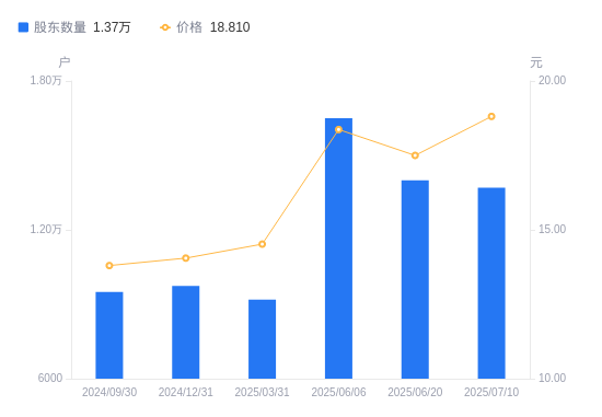 日期A股户数(户)流通A股户均持股数(股)户均持股市值(万元)2025-07-10137007096.1713.352025-06-20140006944.1112.152025-06-06165005891.9810.822025-03-31919210576.3315.362024-12-3197429979.2214.022024-09-30949110243.1314.142024-06-30102789458.8011.232024-03-31108038999.1312.292023-12-31106889095.9616.412023-09-30107309060.3515.86